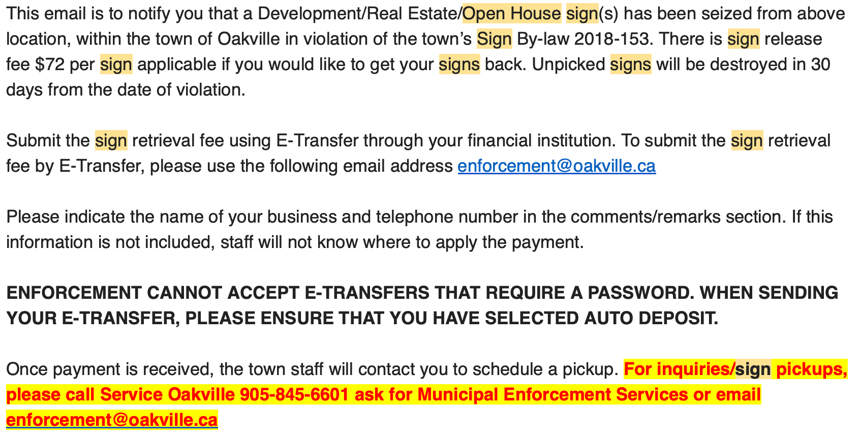 The next day, I received an official email explaining that the H-style signs I had used were not permitted under Oakville’s sign by-law. The signs had been confiscated, and if I wanted to pick them up, I would need to pay an administrative retrieval fee of $72 per sign.