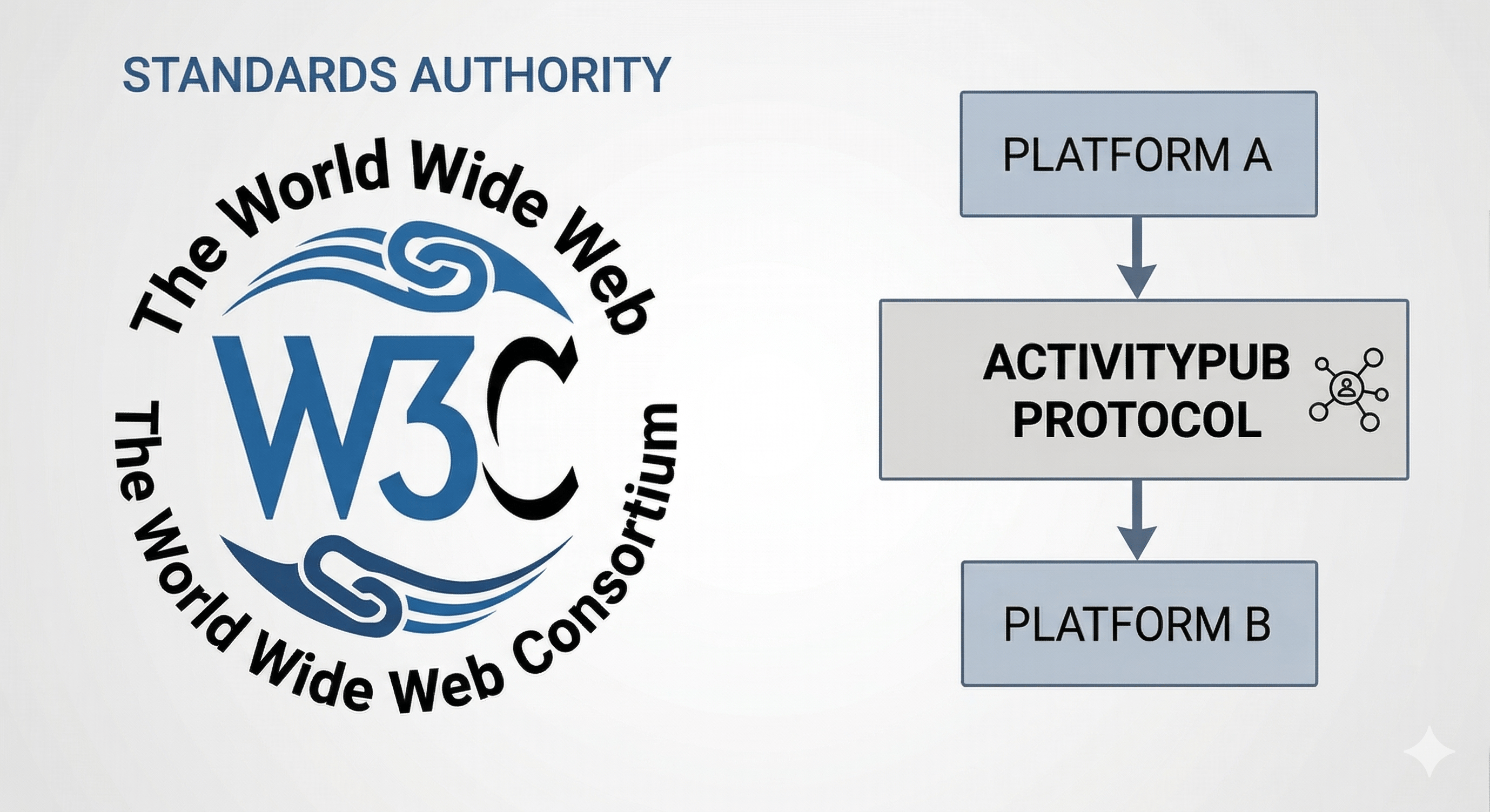 ActivityPub was standardized by the World Wide Web Consortium (W3C) in 2018 — the same organization that sets the rules for how the web itself works. This gives it credibility and long-term stability that proprietary systems don't have.
